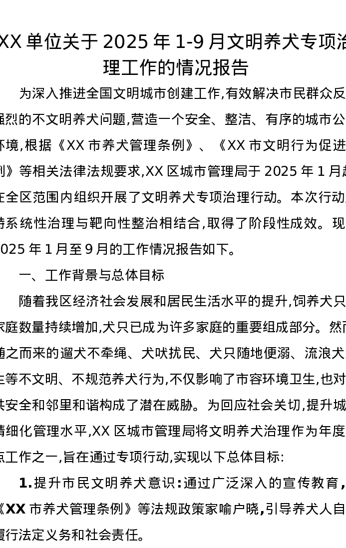 XX单位关于2025年1-9月文明养犬专项治理工作的情况报告