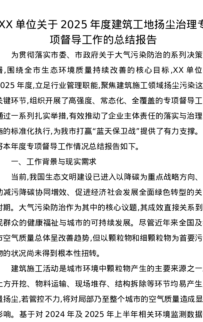 XX单位关于2025年度建筑工地扬尘治理专项督导工作的总结报告