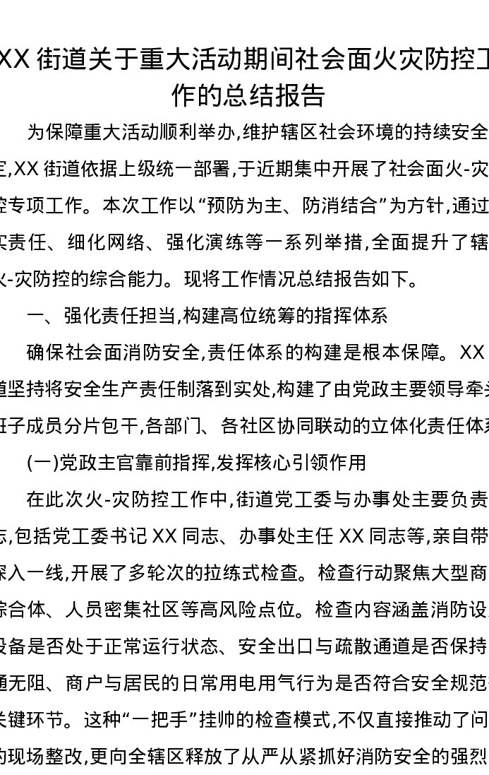 XX街道关于重大活动期间社会面火灾防控工作的总结报告