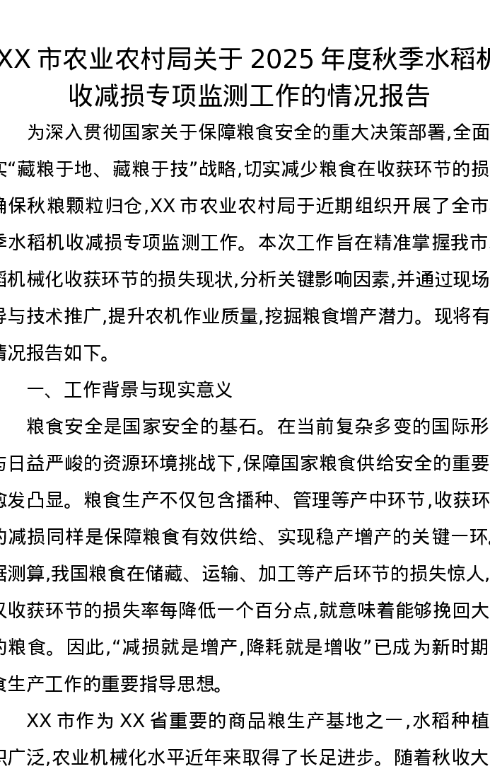 XX市农业农村局关于2025年度秋季水稻机收减损专项监测工作的情况报告
