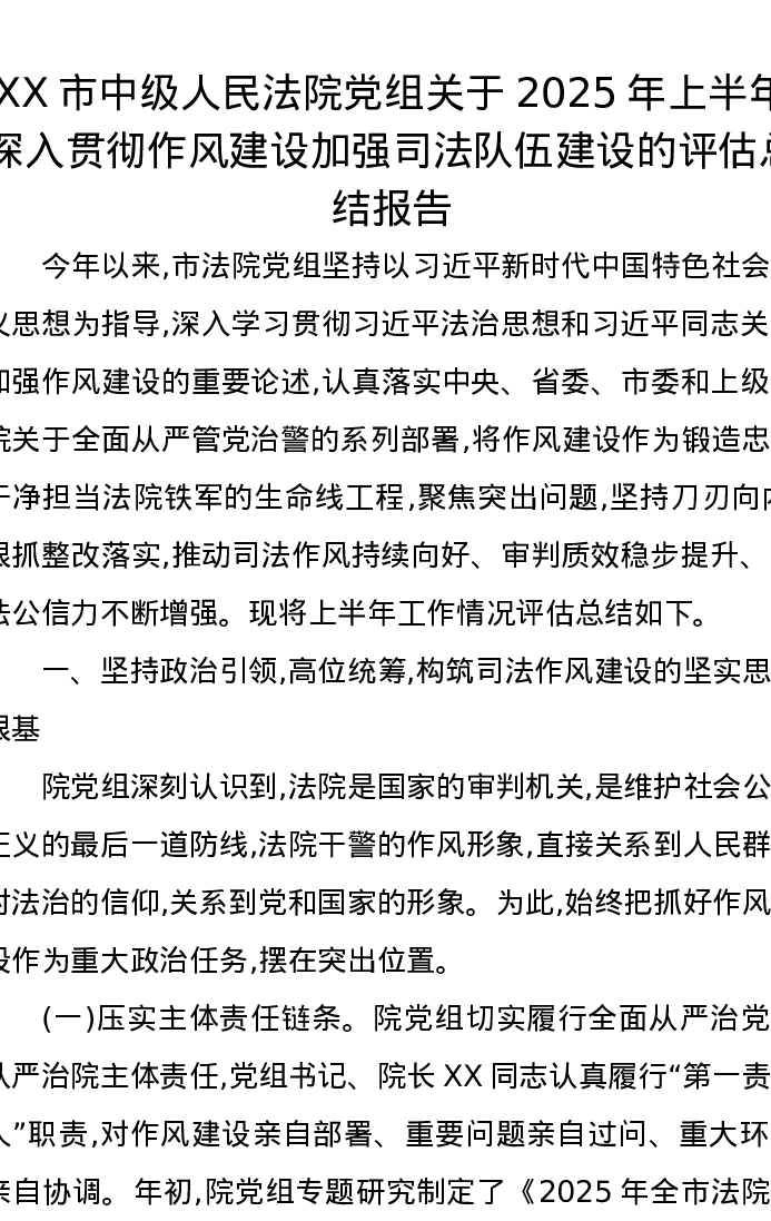 XX市中级人民法院党组关于2025年上半年深入贯彻作风建设加强司法队伍建设的评估总结报告