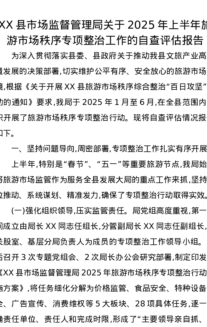 XX县市场监督管理局关于2025年上半年旅游市场秩序专项整治工作的自查评估报告