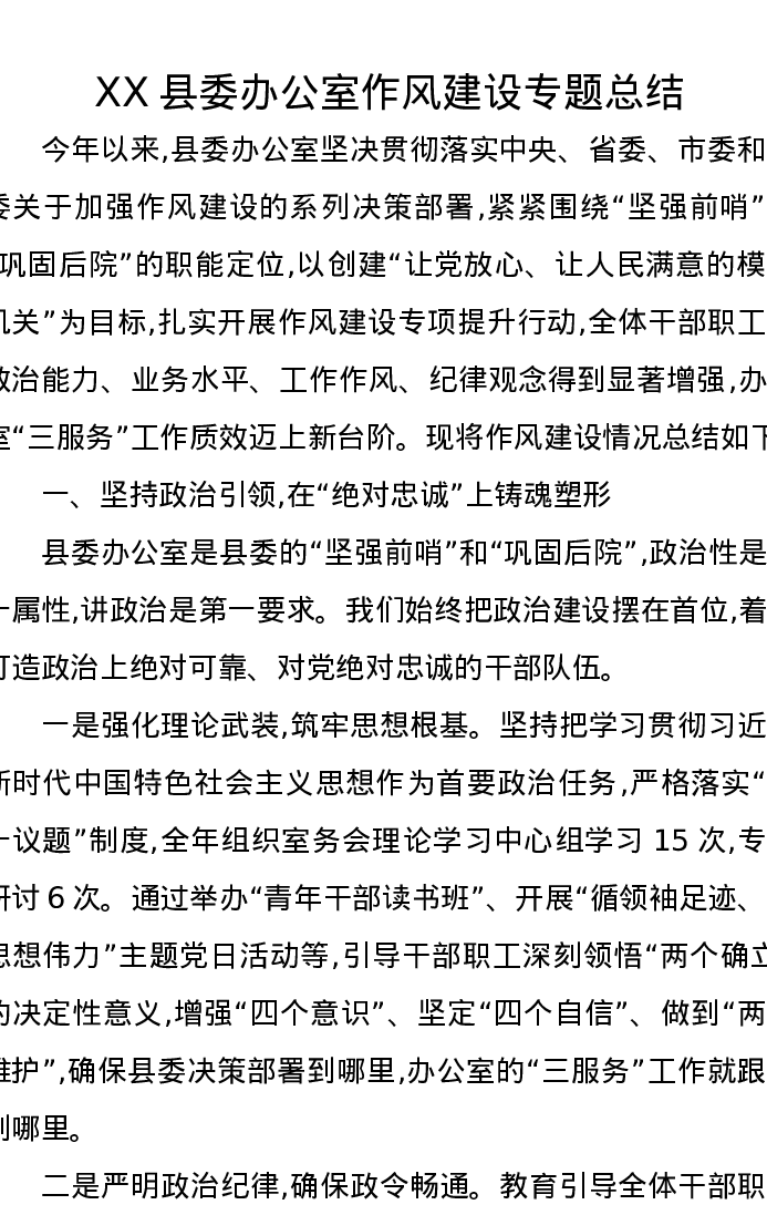 XX县委办公室作风建设专题总结