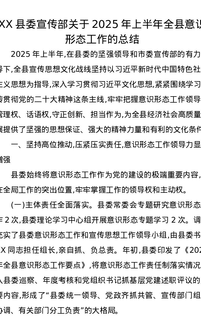 XX县委宣传部关于2025年上半年全县意识形态工作的总结