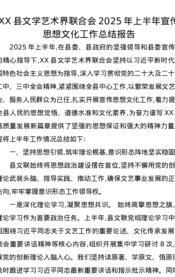 XX县文学艺术界联合会2025年上半年宣传思想文化工作总结报告