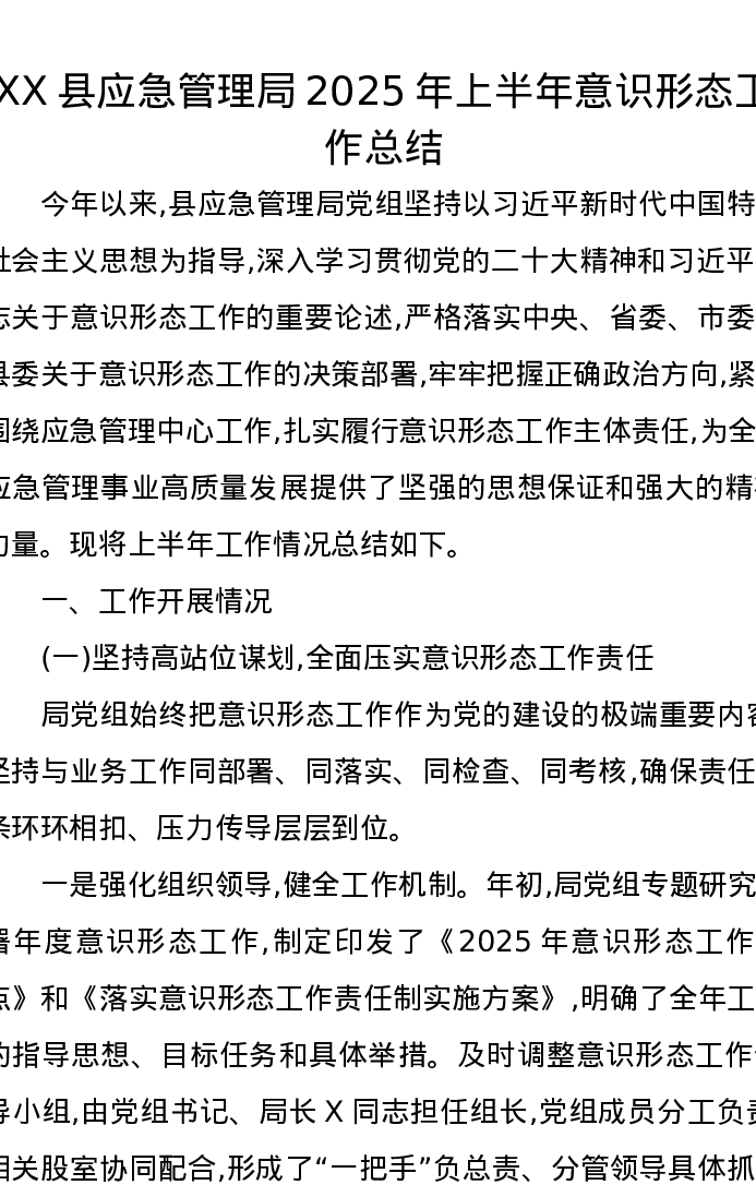XX县应急管理局2025年上半年意识形态工作总结
