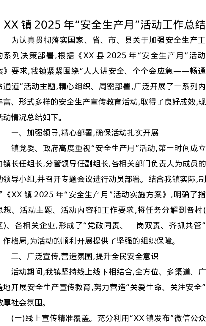 XX镇2025年“安全生产月”活动工作总结