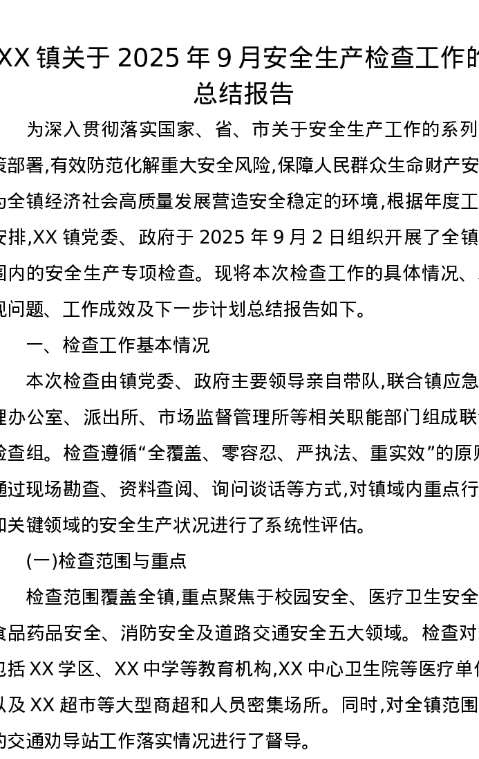 XX镇关于2025年9月安全生产检查工作的总结报告
