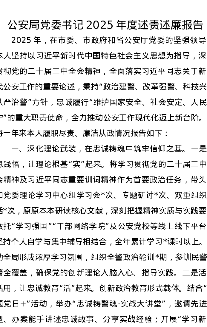 公安局党委书记2025年度述责述廉报告