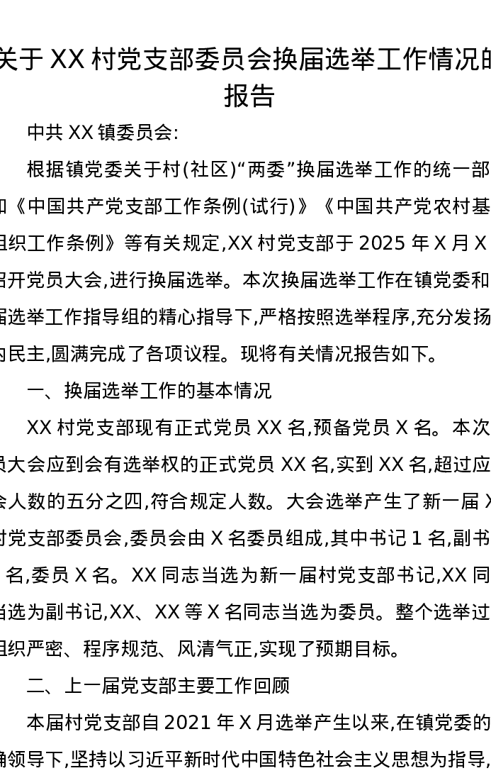 关于XX村党支部委员会换届选举工作情况的报告