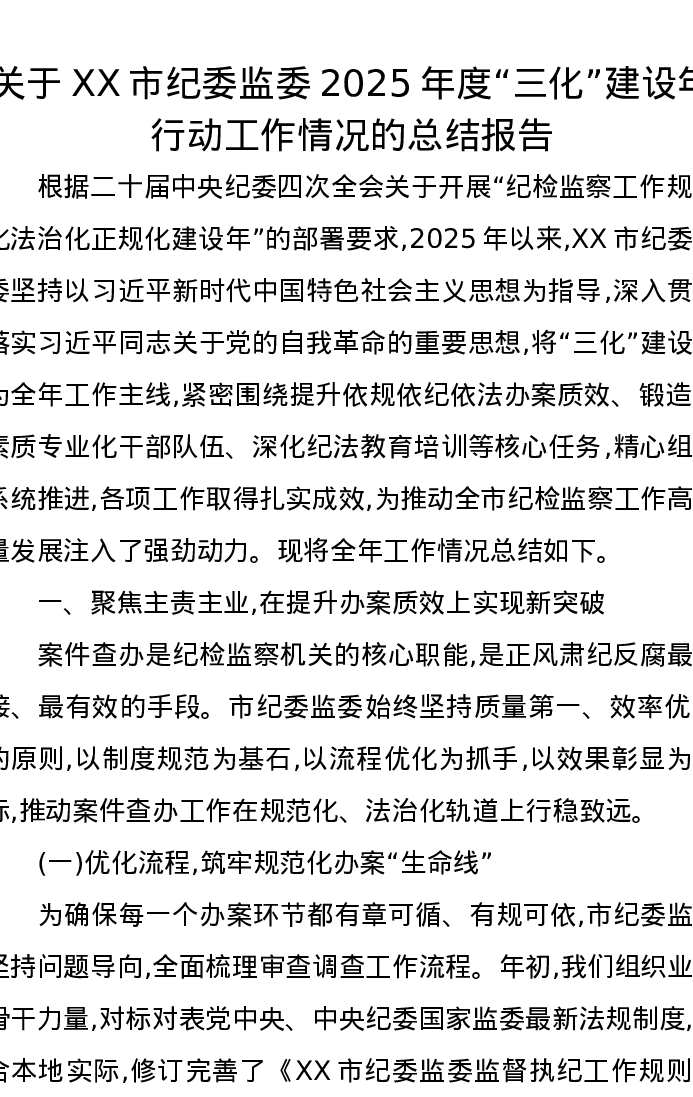 关于XX市纪委监委2025年度“三化”建设年行动工作情况的总结报告