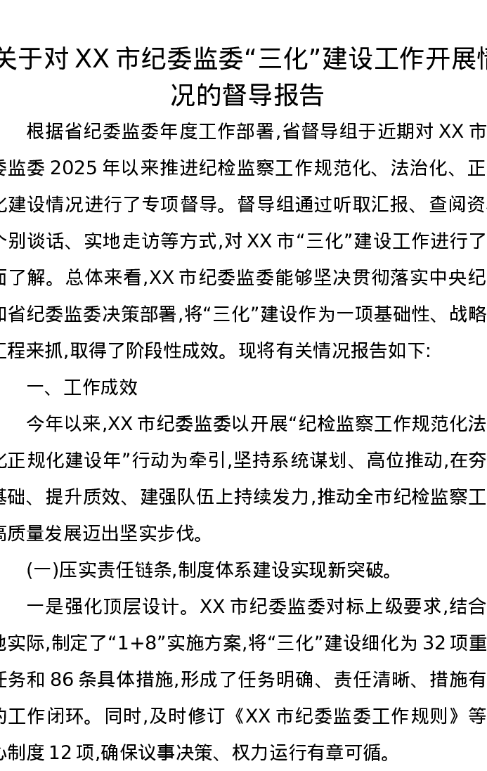 关于对XX市纪委监委“三化”建设工作开展情况的督导报告