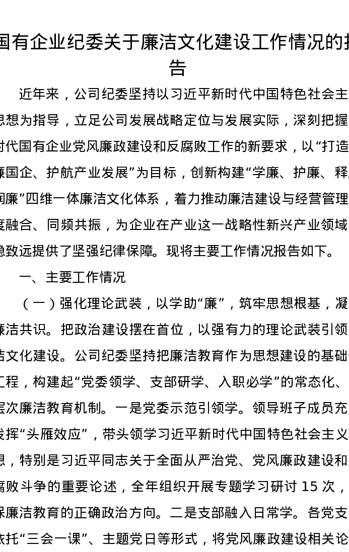 国有企业纪委关于廉洁文化建设工作情况的报告