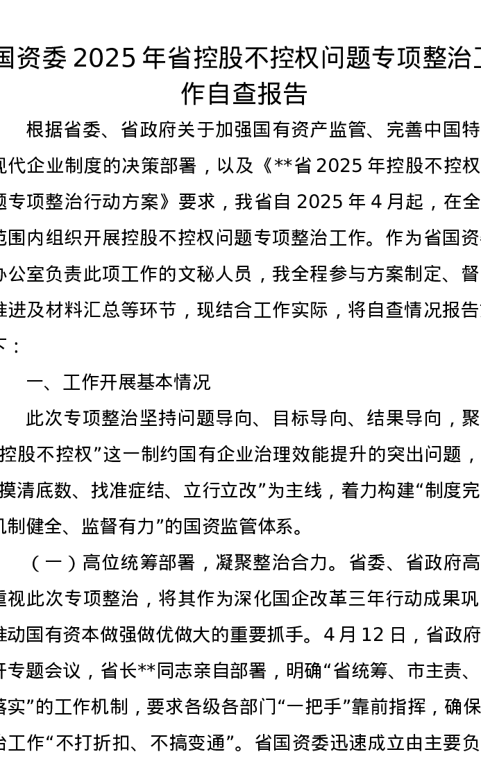 国资委2025年省控股不控权问题专项整治工作自查报告