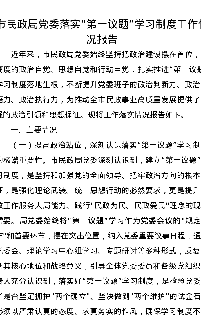 市民政局党委落实“第一议题”学习制度工作情况报告