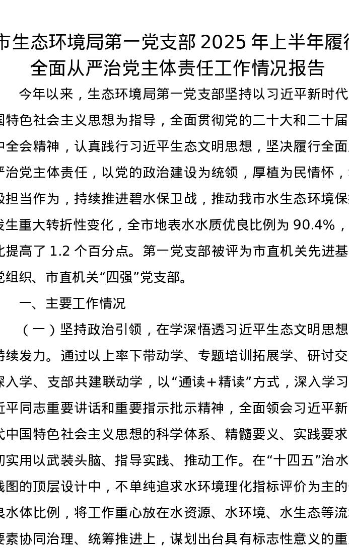 市生态环境局第一党支部2025年上半年履行全面从严治党主体责任工作情况报告