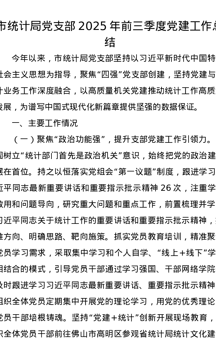 市统计局党支部2025年前三季度党建工作总结