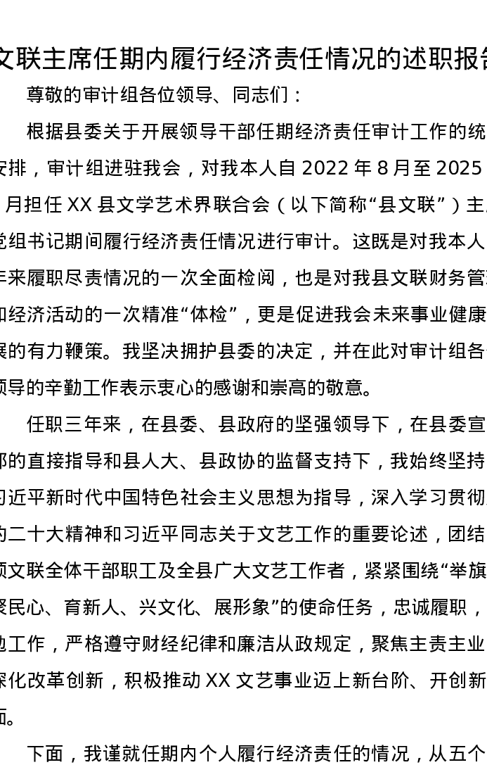 文联主席任期内履行经济责任情况的述职报告