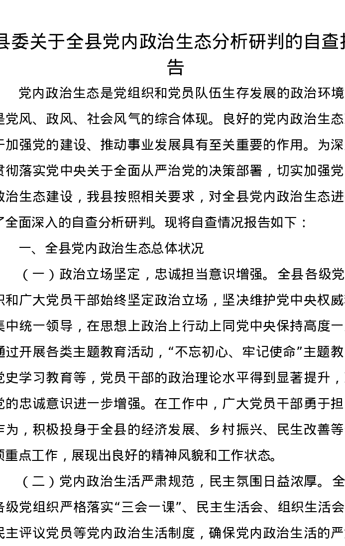 县委关于全县党内政治生态分析研判的自查报告