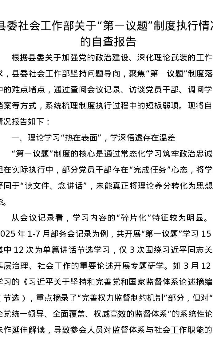 县委社会工作部关于“第一议题”制度执行情况的自查报告