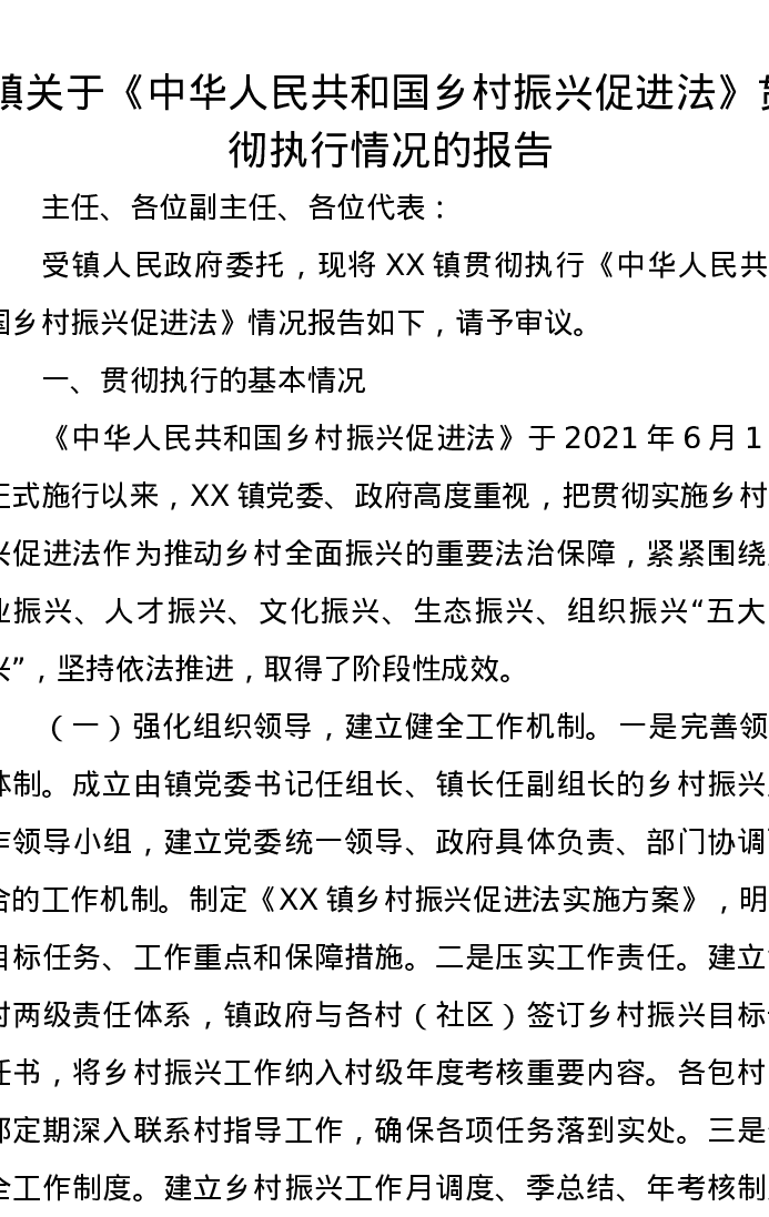 镇关于《中华人民共和国乡村振兴促进法》贯彻执行情况的报告