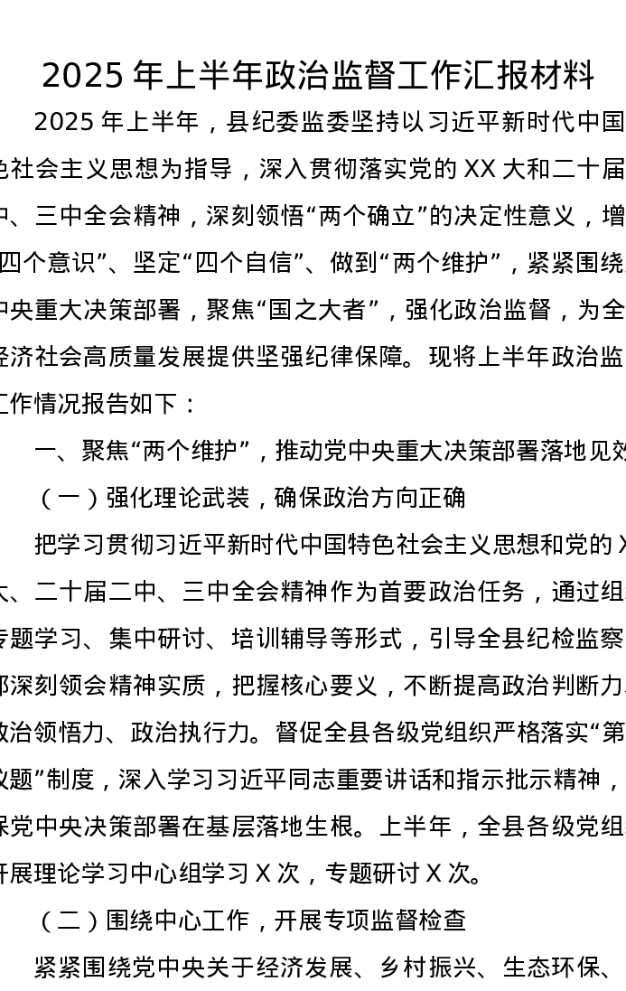 2025年上半年政治监督工作汇报材料