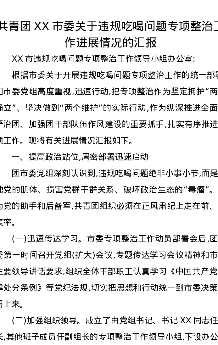 共青团XX市委关于违规吃喝问题专项整治工作进展情况的汇报