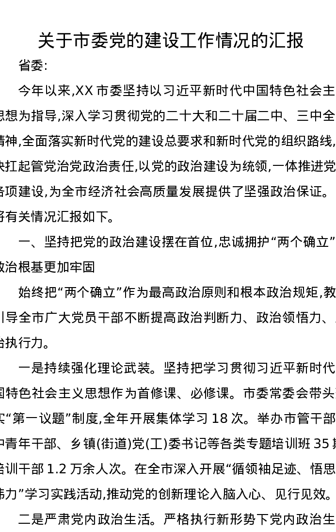 关于市委党的建设工作情况的汇报
