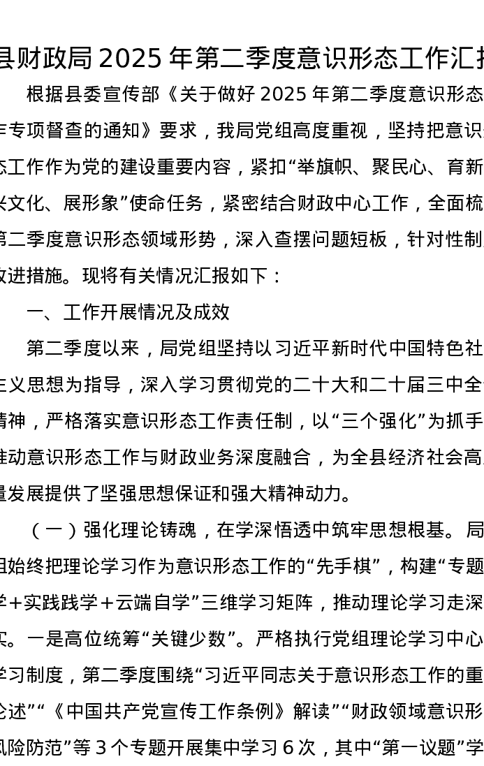 县财政局2025年第二季度意识形态工作汇报