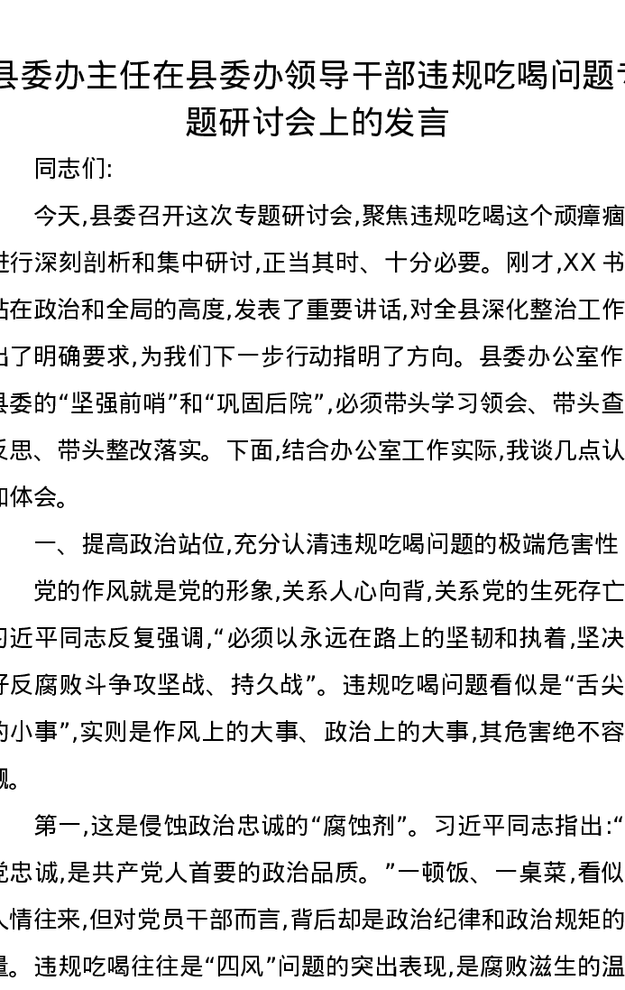 县委办主任在县委办领导干部违规吃喝问题专题研讨会上的发言