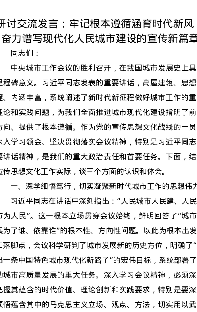 研讨交流发言:牢记根本遵循涵育时代新风,奋力谱写现代化人民城市建设的宣传新篇章