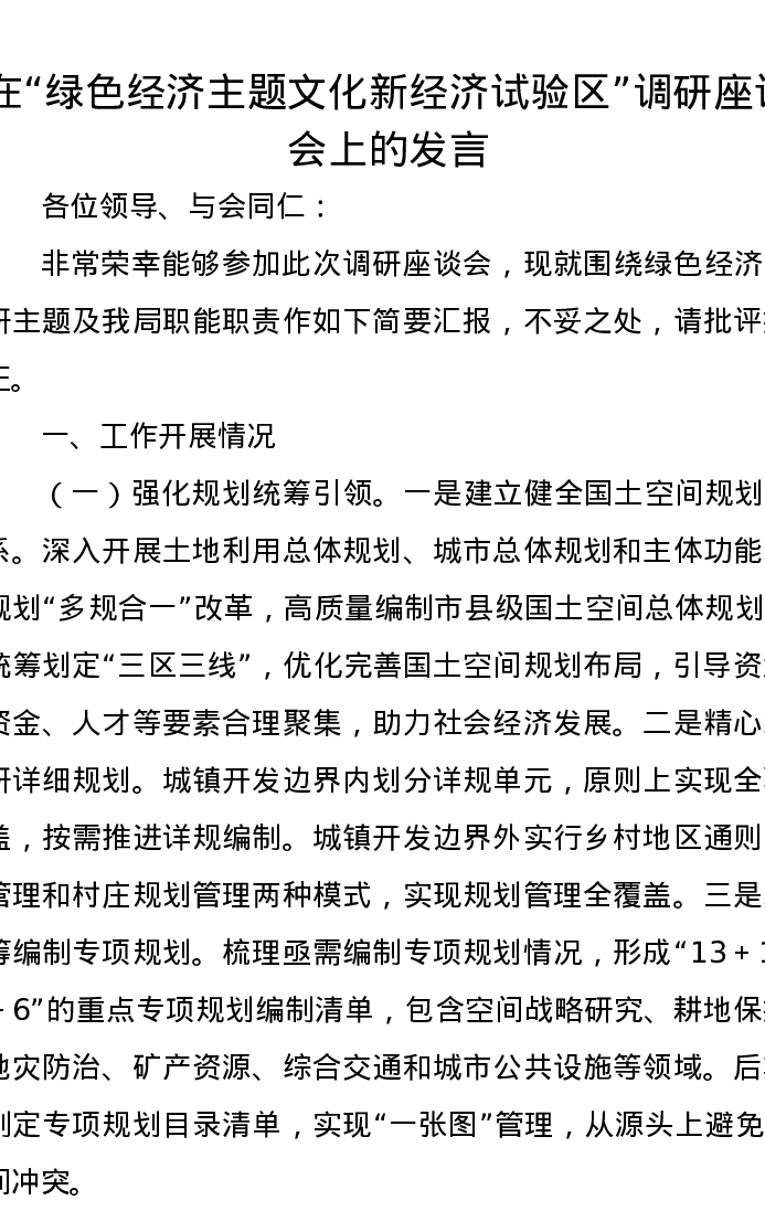 在“绿色经济主题文化新经济试验区”调研座谈会上的发言