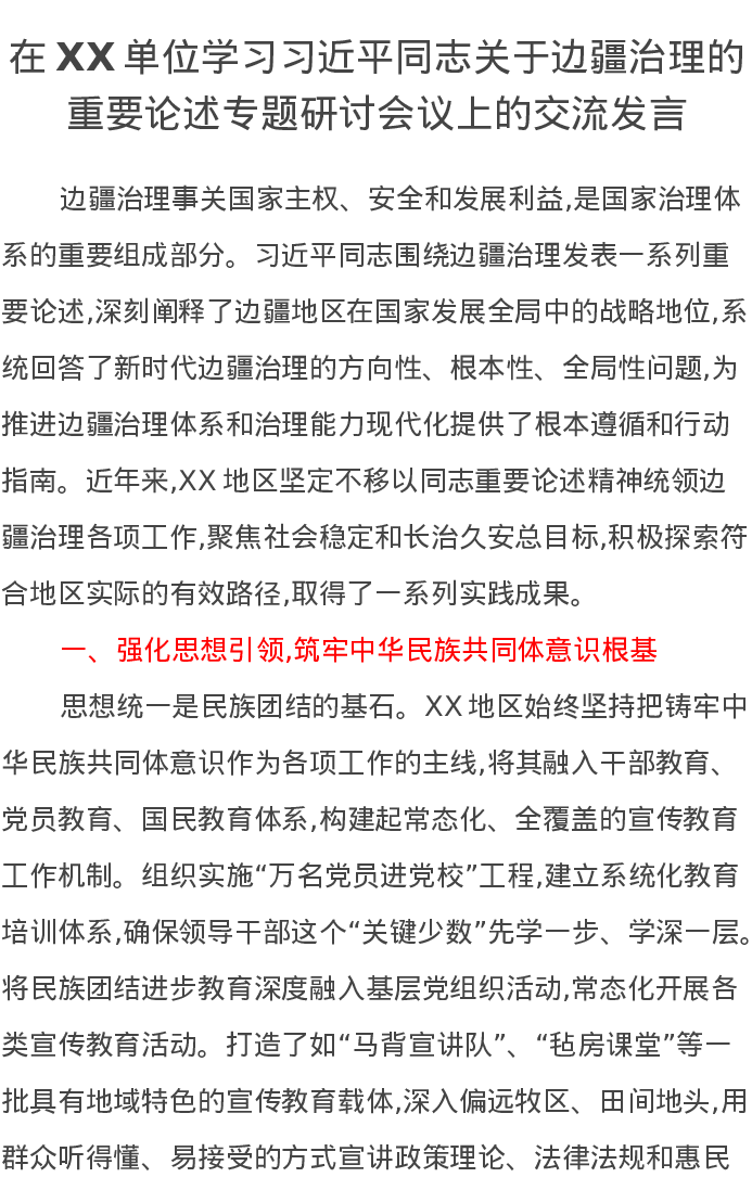 在XX单位学习习近平总书记关于边疆治理的重要论述专题研讨会议上的交流发言