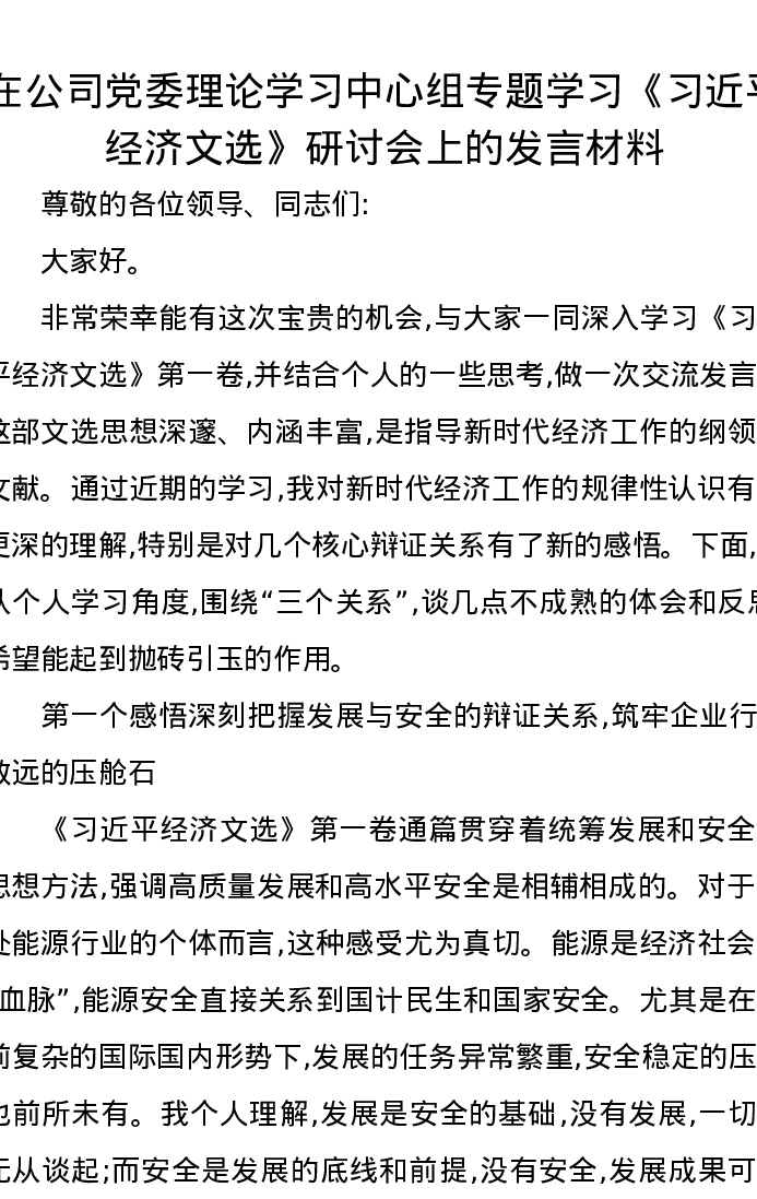 在公司党委理论学习中心组专题学习《习近平经济文选》研讨会上的发言材料