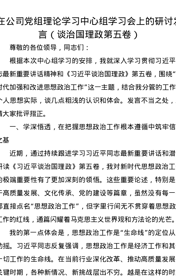 在公司党组理论学习中心组学习会上的研讨发言(谈治国理政第五卷)