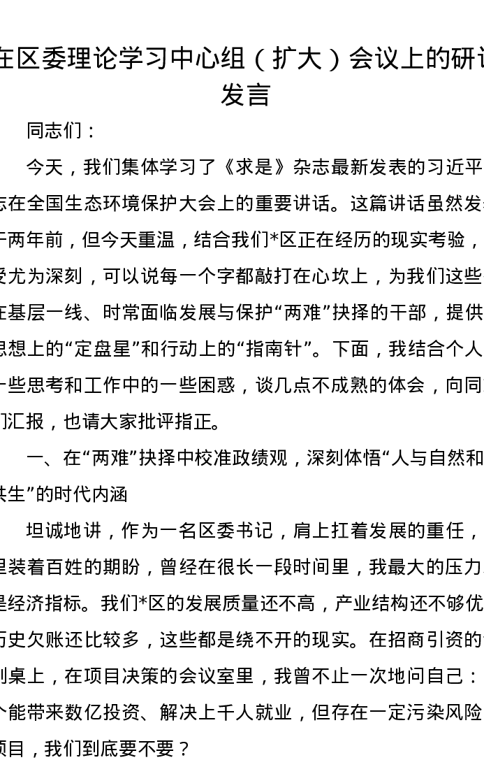在区委理论学习中心组(扩大)会议上的研讨发言