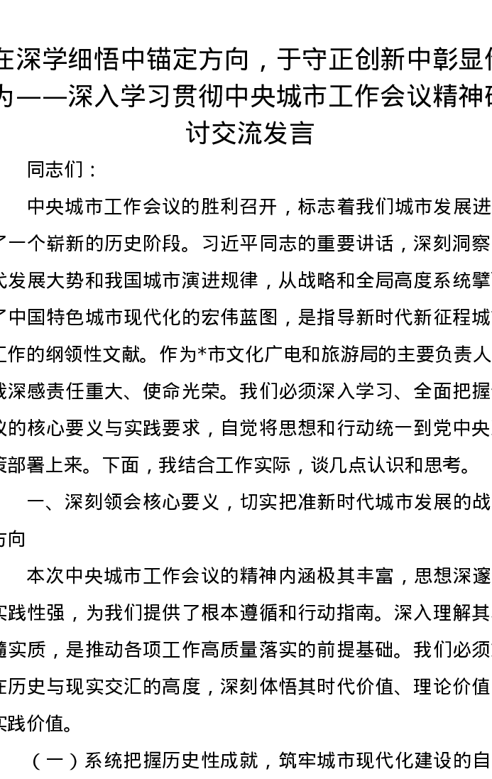 在深学细悟中锚定方向,于守正创新中彰显作为——深入学习贯彻中央城市工作会议精神研讨交流发言