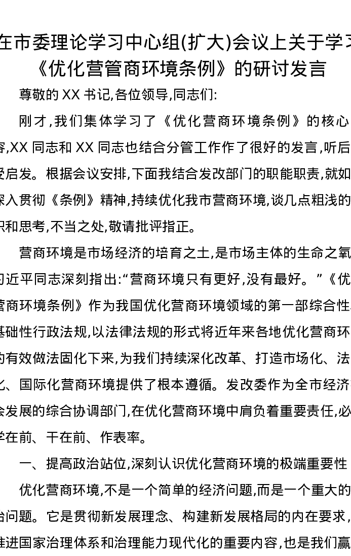 在市委理论学习中心组(扩大)会议上关于学习《优化营管商环境条例》的研讨发言