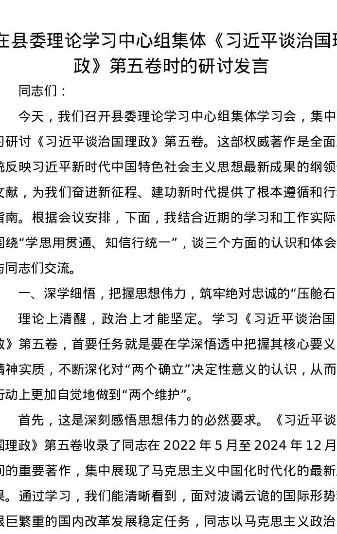 在县委理论学习中心组集体《习近平谈治国理政》第五卷时的研讨发言