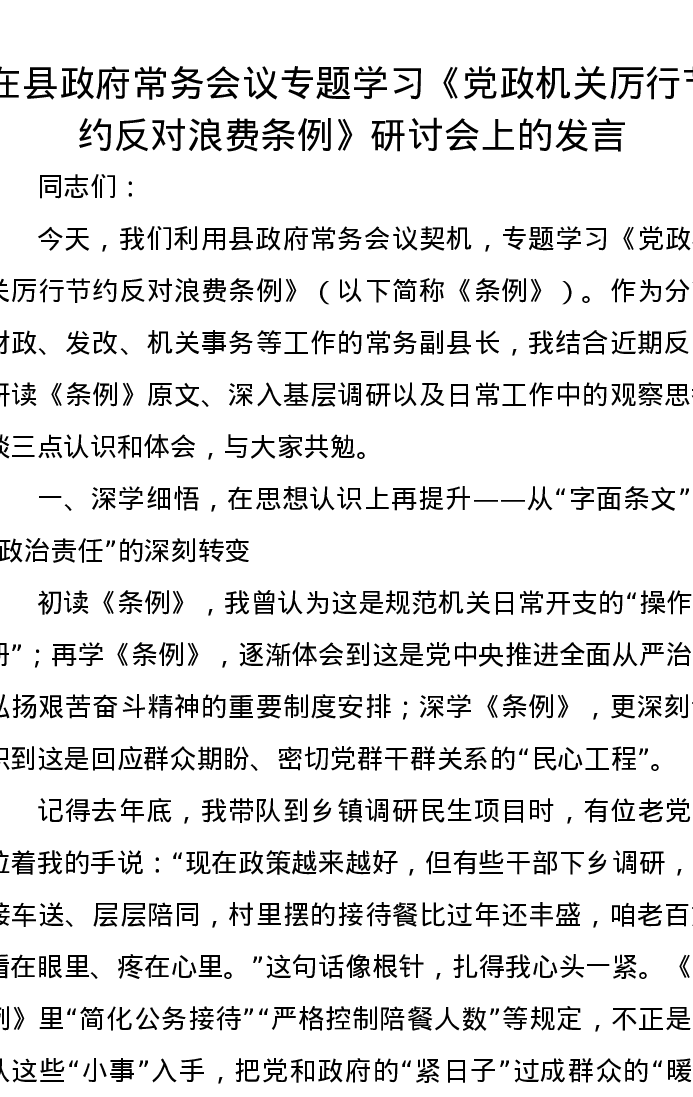 在县政府常务会议专题学习《党政机关厉行节约反对浪费条例》研讨会上的发言