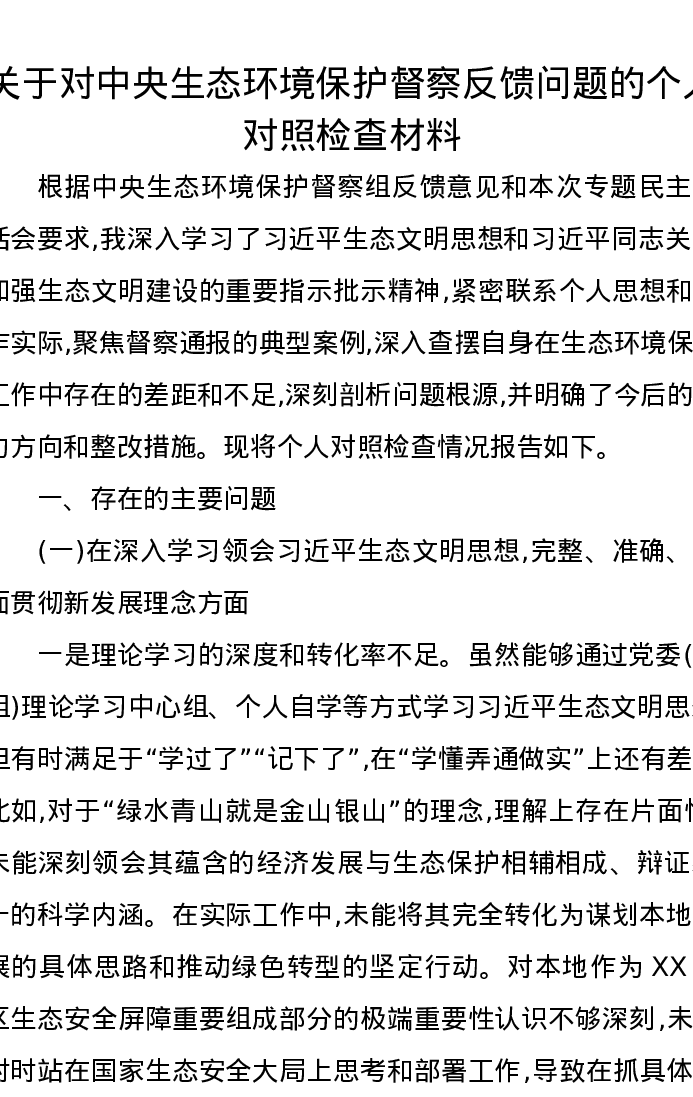 关于对中央生态环境保护督察反馈问题的个人对照检查材料