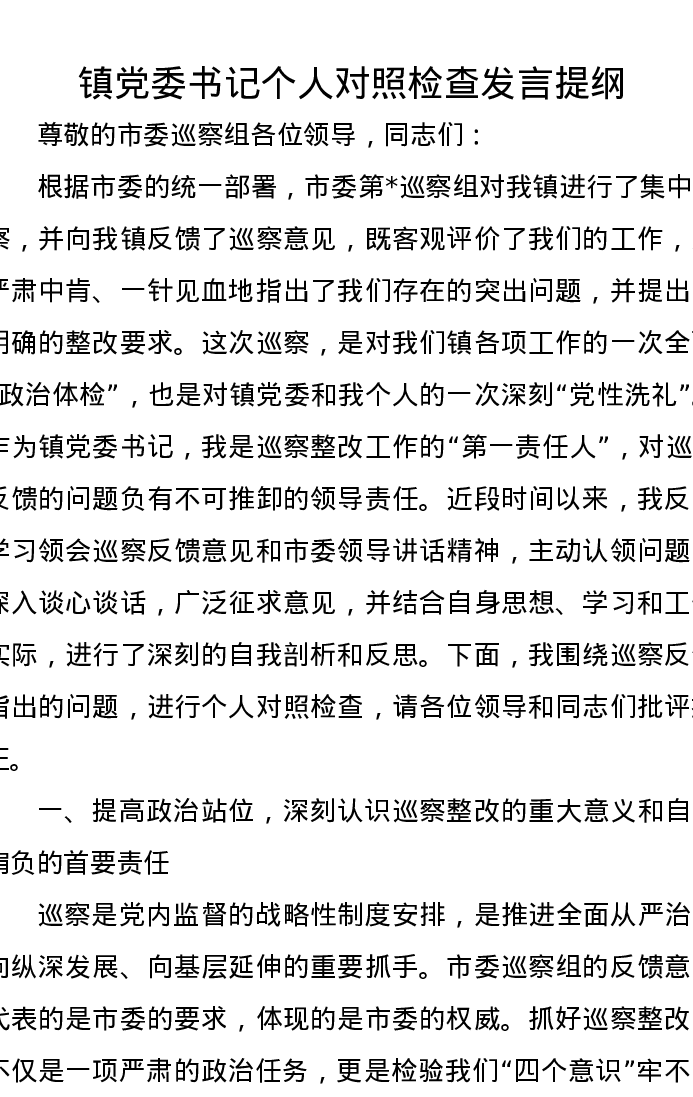 镇党委书记个人对照检查发言提纲(巡视巡察)
