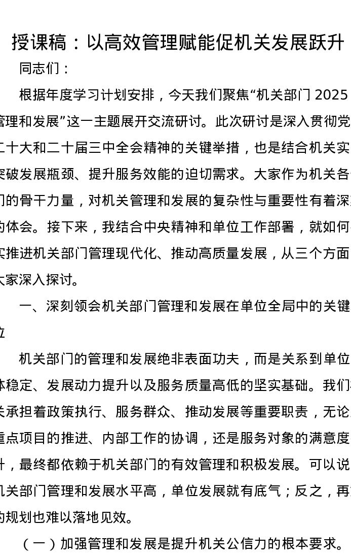 授课稿:以高效管理赋能 促机关发展跃升