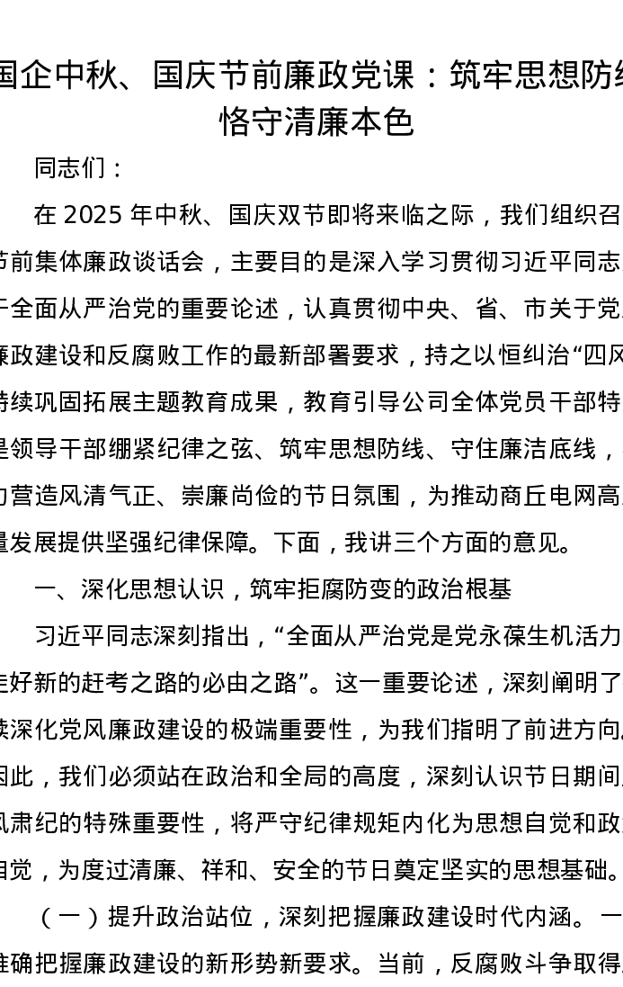 国企中秋、国庆节前廉政党课:筑牢思想防线,恪守清廉本色