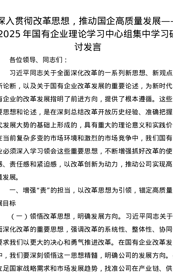 深入贯彻改革思想,推动国企高质量发展——2025年国有企业理论学习中心组集中学习研讨发言
