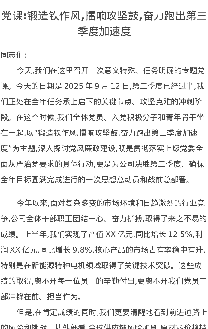 党课讲稿:锻造铁作风,擂响攻坚鼓,奋力跑出第三季度加速度