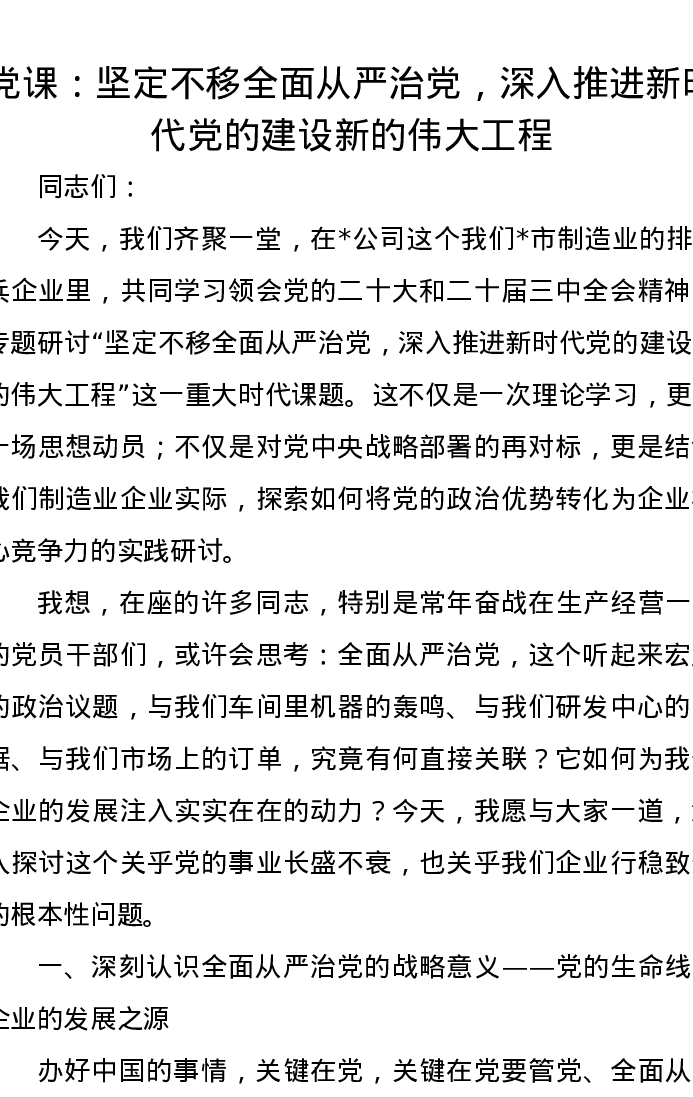 党课讲稿:坚定不移全面从严治党,深入推进新时代党的建设新的伟大工程