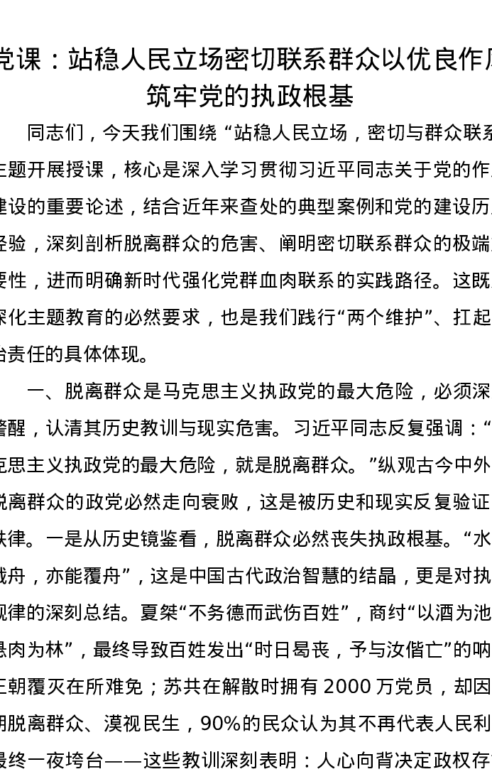 党课讲稿:站稳人民立场 密切联系群众 以优良作风筑牢党的执政根基