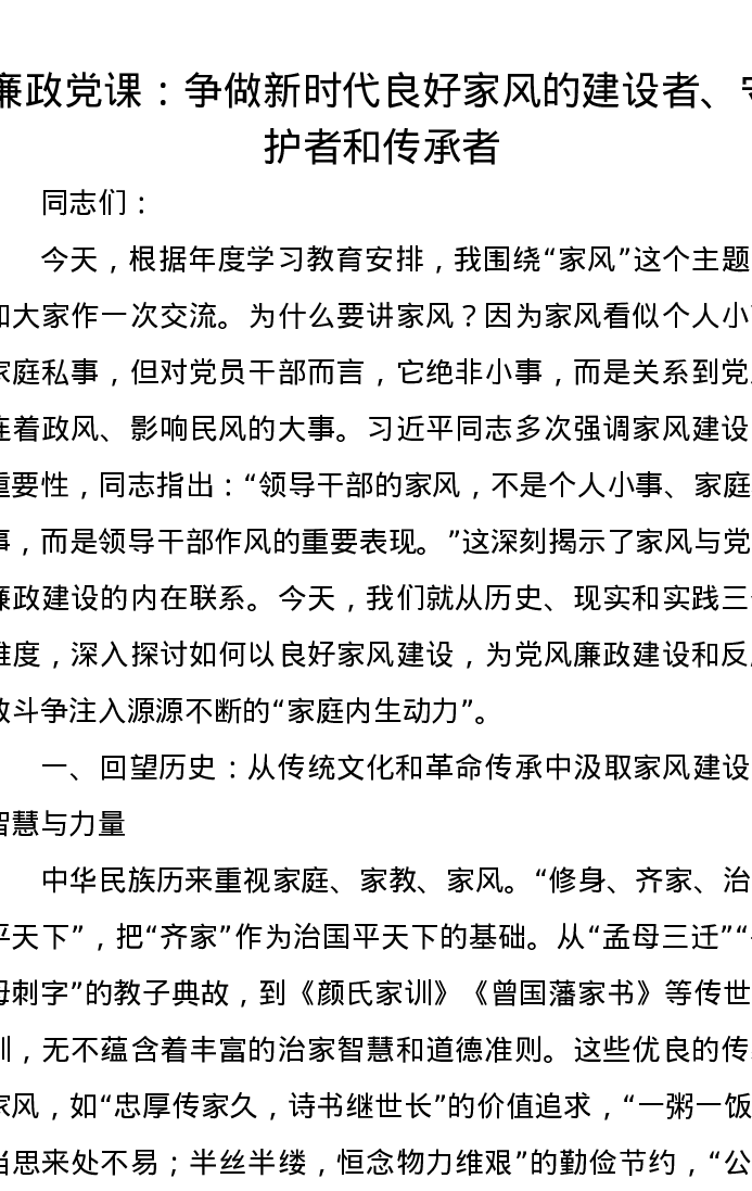廉政党课讲稿:争做新时代良好家风的建设者、守护者和传承者