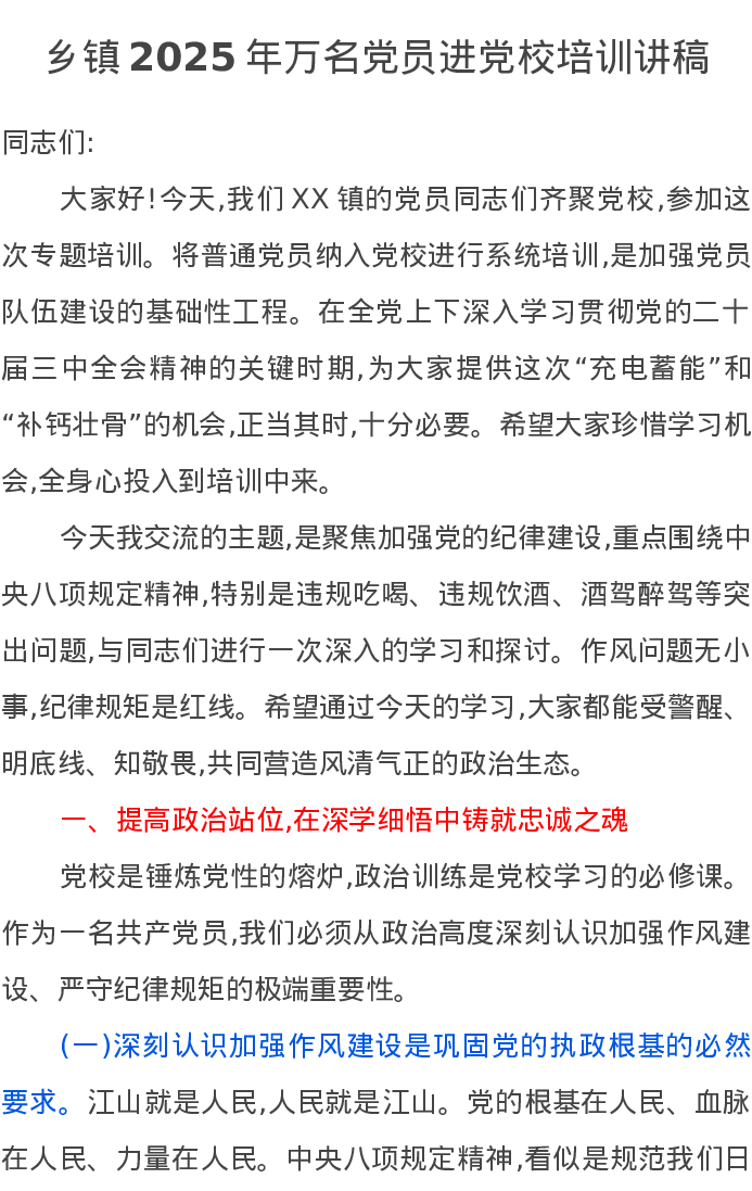 乡镇2025年万名党员进党校培训讲稿